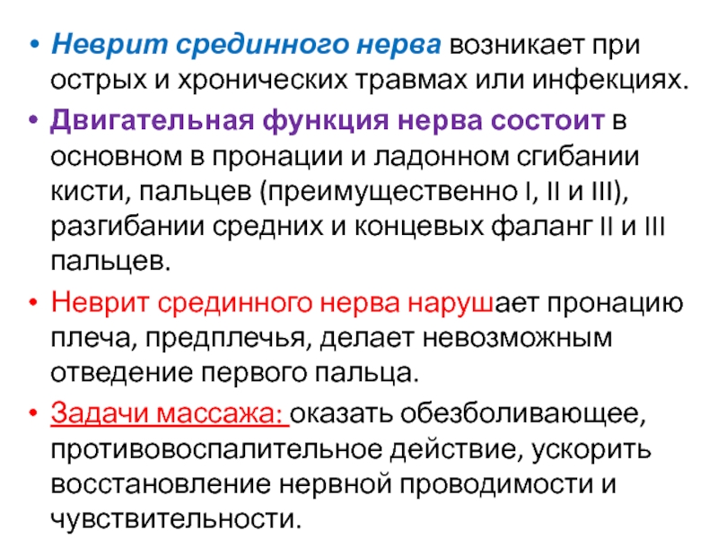 Слайд 30Неврит срединного нерва возникает при острых и хронических травмах или