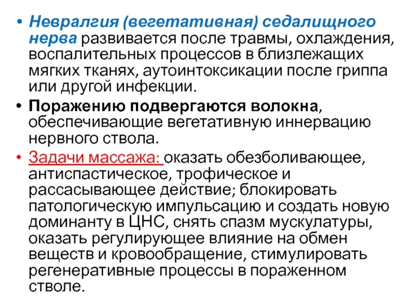 Слайд 34Невралгия (вегетативная) седалищного нерва развивается после травмы, охлаждения, воспалительных процессов