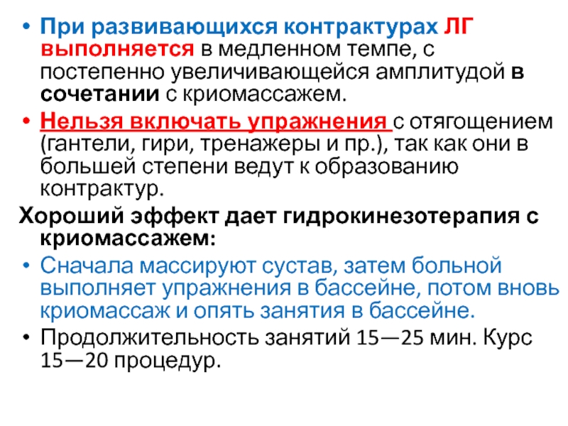 Слайд 37При развивающихся контрактурах ЛГ выполняется в медленном темпе, с постепенно