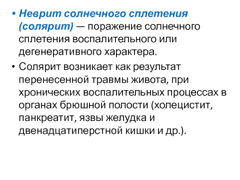 Слайд 27Неврит солнечного сплетения (солярит) — поражение солнечного сплетения воспалительного или