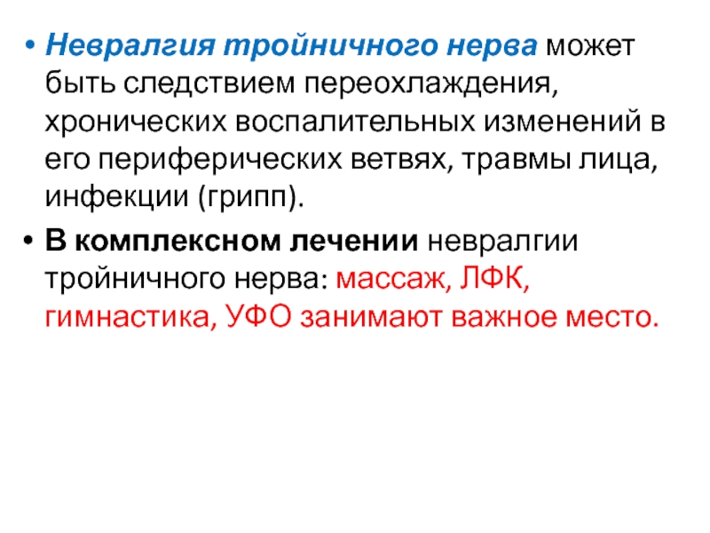 Слайд 23Невралгия тройничного нерва может быть следствием переохлаждения, хронических воспалительных изменений