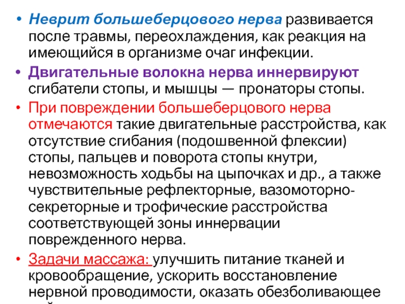 Слайд 31Неврит большеберцового нерва развивается после травмы, переохлаждения, как реакция на