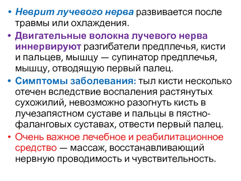 Слайд 29Неврит лучевого нерва развивается после травмы или охлаждения.