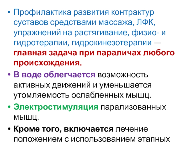 Слайд 9Профилактика развития контрактур суставов средствами массажа, ЛФК, упражнений на растягивание,