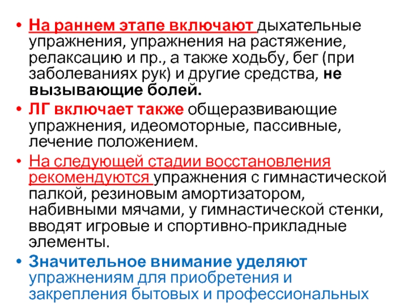 Слайд 36На раннем этапе включают дыхательные упражнения, упражнения на растяжение, релаксацию