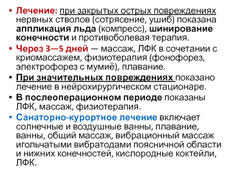 Слайд 13Лечение: при закрытых острых повреждениях нервных стволов (сотрясение, ушиб) показана