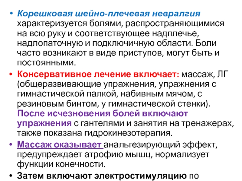 Слайд 25Корешковая шейно-плечевая невралгия характеризуется болями, распространяющимися на всю руку и