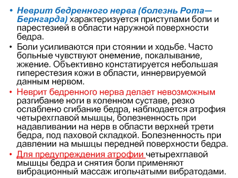 Слайд 33Неврит бедренного нерва (болезнь Рота—Бернгарда) характеризуется приступами боли и парестезией
