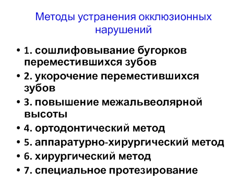 Методы устранения окклюзионных нарушений1. сошлифовывание бугорков переместившихся зубов2. укорочение переместившихся зубов3. повышение межальвеолярной высоты4. ортодонтический метод5. аппаратурно-хирургический