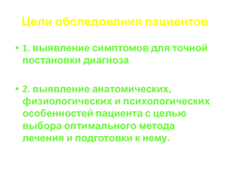 Цели обследования пациентов1. выявление симптомов для точной постановки диагноза2. выявление анатомических, физиологических и психологических особенностей пациента с
