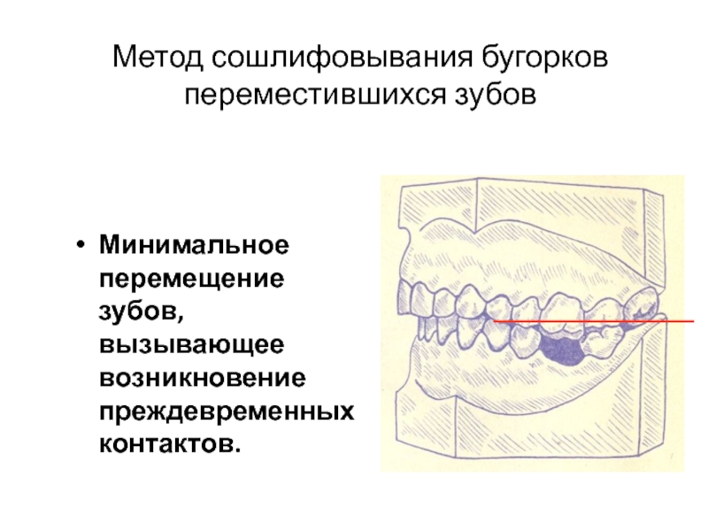 Слайд 10Метод сошлифовывания бугорков переместившихся зубов