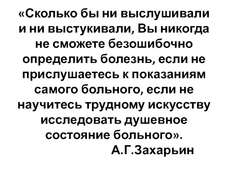 больного, если не научитесь трудному искусству исследовать душевное состояние больного». А.Г.Захарьин
