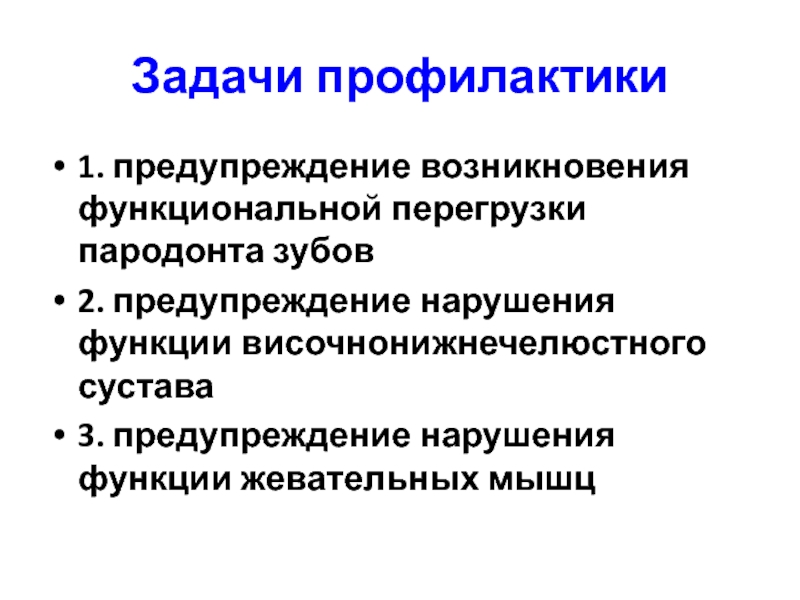 Задачи профилактики1. предупреждение возникновения функциональной перегрузки пародонта зубов2. предупреждение нарушения функции височнонижнечелюстного сустава3. предупреждение нарушения функции жевательных