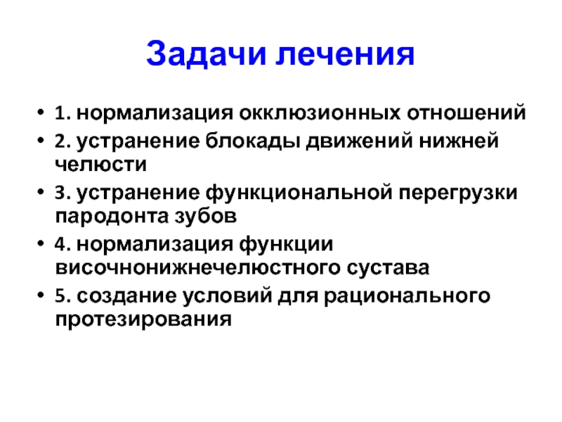 Задачи лечения1. нормализация окклюзионных отношений2. устранение блокады движений нижней челюсти3. устранение функциональной перегрузки пародонта зубов4. нормализация функции