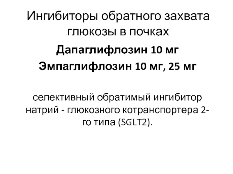 Слайд 32Ингибиторы обратного захвата глюкозы в почках