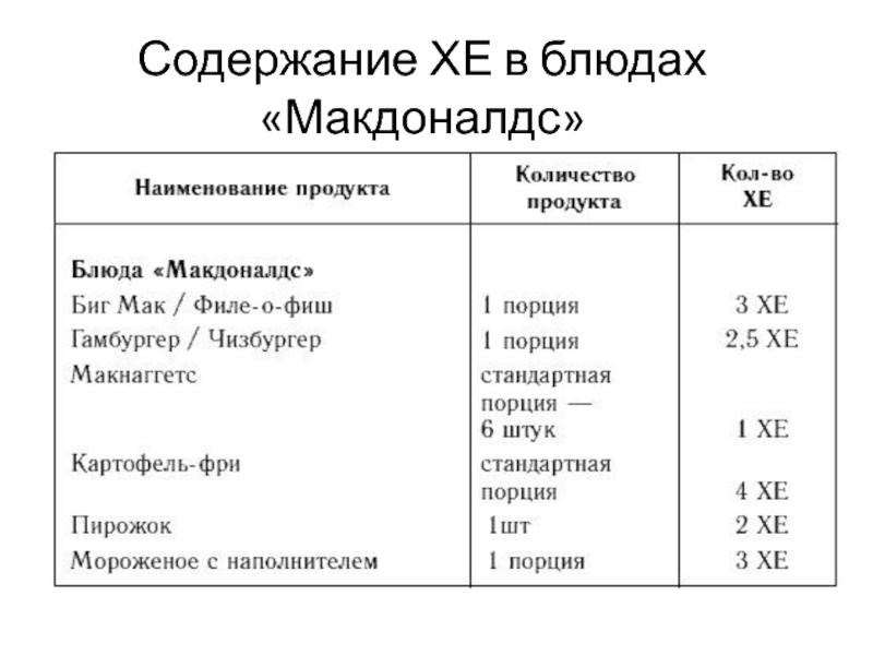 Слайд 50Содержание ХЕ в блюдах «Макдоналдс»