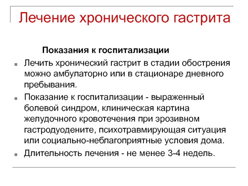 Показание к госпитализации - выраженный болевой синдром, клиническая картина желудочного кровотечения при эрозивном гастродуодените, психотравмирующая ситуация или социально-неблагоприятные условия дома.