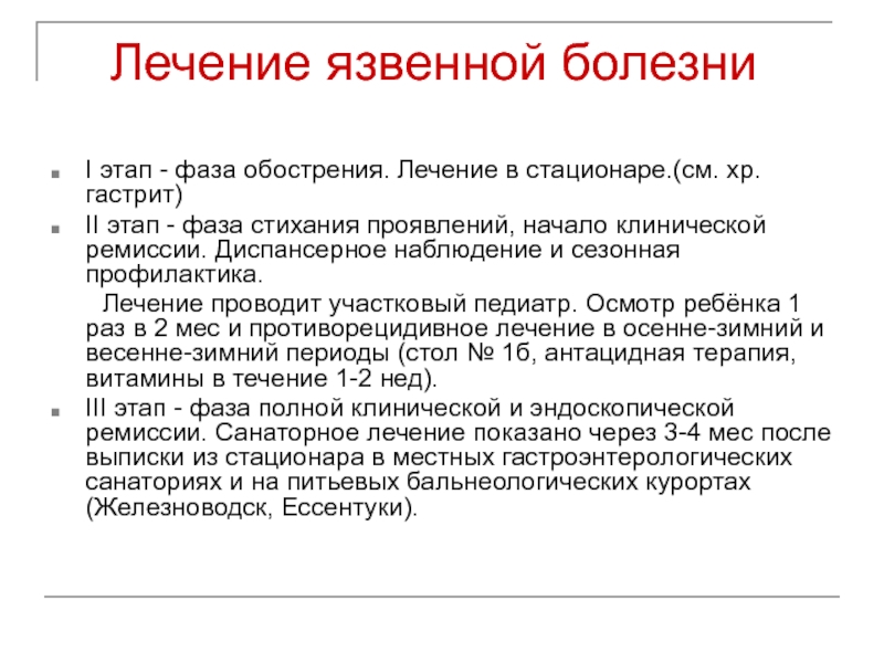 III этап - фаза полной клинической и эндоскопической ремиссии. Санаторное лечение показано через 3-4 мес после выписки из стационара в местных гастроэнтерологических санаториях и на питьевых бальнеологических курортах (Железноводск, Ессентуки).