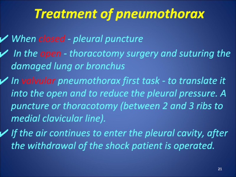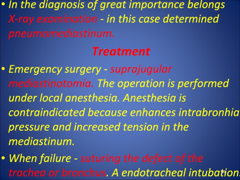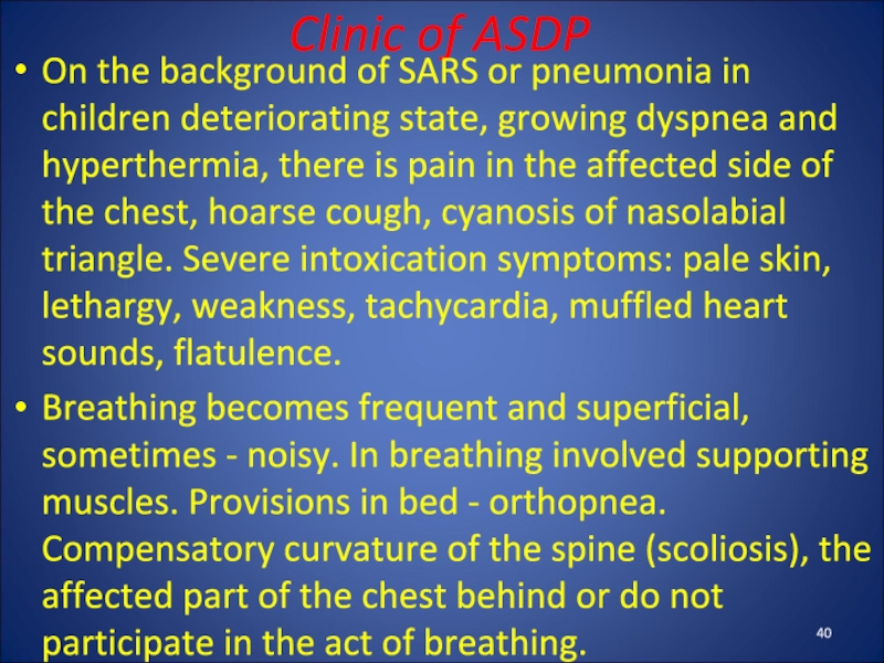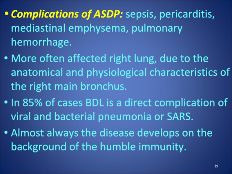Слайд 39Complications of ASDP: sepsis, pericarditis, mediastinal emphysema, pulmonary hemorrhage.