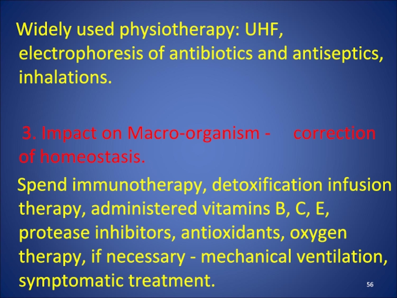 Слайд 56 Widely used physiotherapy: UHF, electrophoresis of antibiotics and