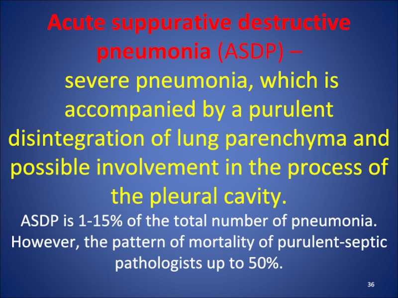Слайд 36Acute suppurative destructive pneumonia (ASDP) –