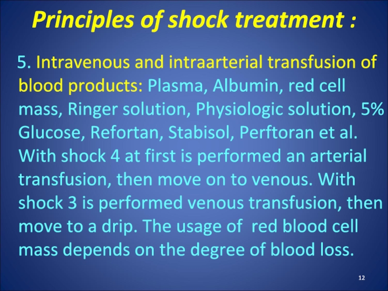 solution, Physiologic solution, 5% Glucose, Refortan, Stabisol, Perftoran et al. With shock 4 at first is performed an arterial transfusion, then move on to venous. With shock 3 is performed venous transfusion, then move to a drip. The usage of red blood cell mass depends on the degree of blood loss.