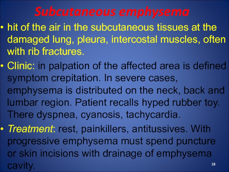 Fractures of the ribs with displacement lead to damage of the pleura, lungs, blood vessels, accompanied by pneumohemotorax and subcutaneous emphysema.