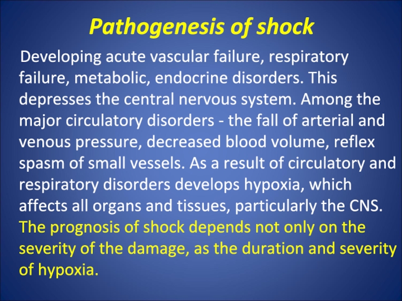 the major circulatory disorders - the fall of arterial and venous pressure, decreased blood volume, reflex spasm of small vessels. As a result of circulatory and respiratory disorders develops hypoxia, which affects all organs and tissues, particularly the CNS. The prognosis of shock depends not only on the severity of the damage, as the duration and severity of hypoxia.