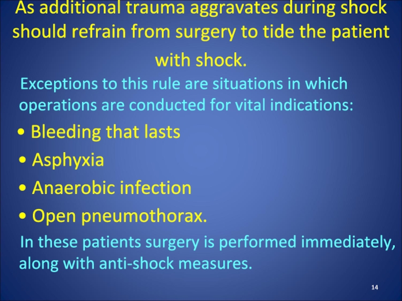 Слайд 14As additional trauma aggravates during shock should refrain from surgery