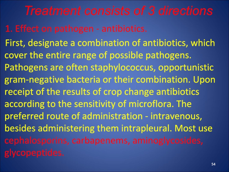 which cover the entire range of possible pathogens. Pathogens are often staphylococcus, opportunistic gram-negative bacteria or their combination. Upon receipt of the results of crop change antibiotics according to the sensitivity of microflora. The preferred route of administration - intravenous, besides administering them intrapleural. Most use cephalosporins, carbapenems, aminoglycosides, glycopeptides.