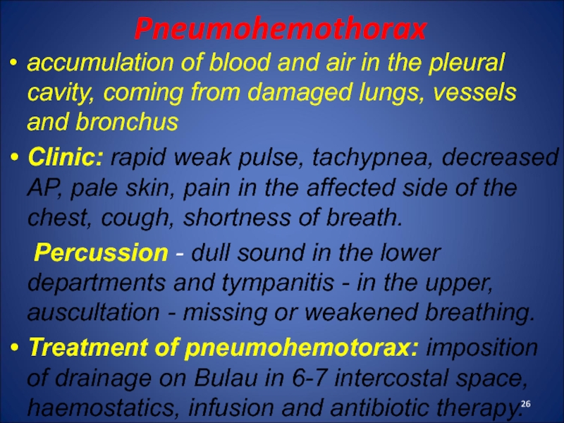Among the closed chest trauma is released concussion, contusion, compression of the chest, pneumothorax, hemothorax, pneumohemothorax, subcutaneous and mediastinal emphysema.