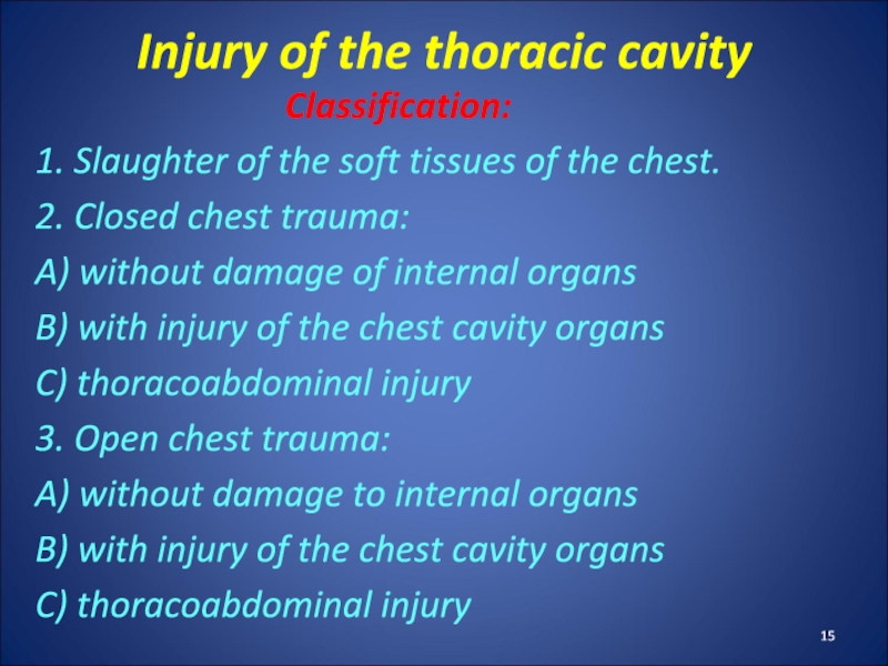 Слайд 15Injury of the thoracic cavity