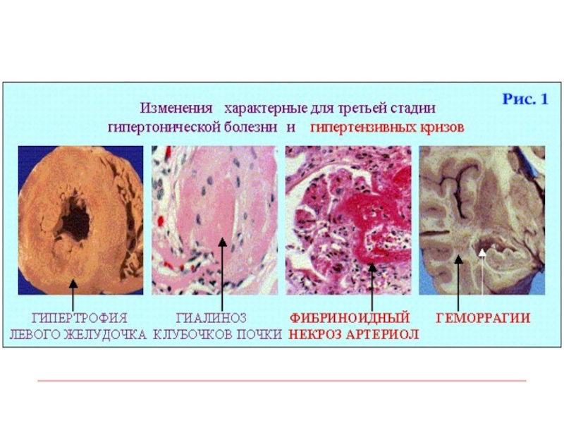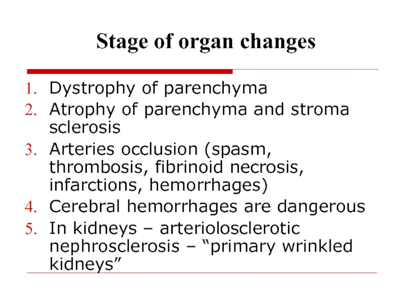 Arteries occlusion (spasm, thrombosis, fibrinoid necrosis, infarctions, hemorrhages)