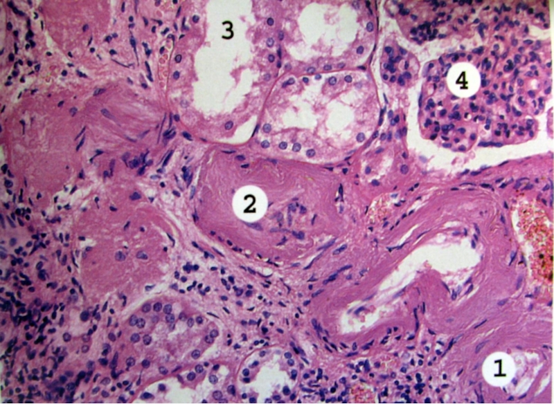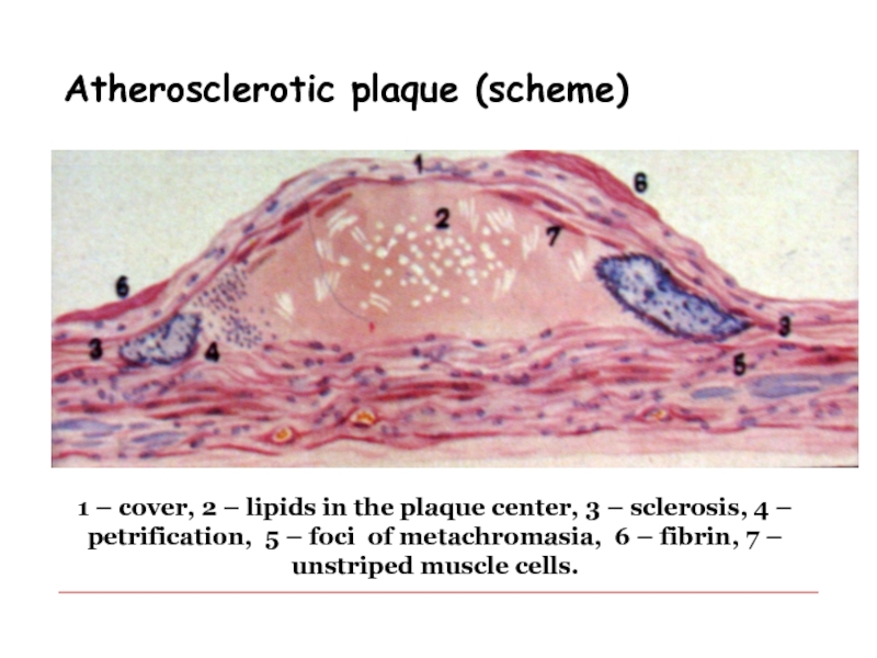 plaque center, 3 – sclerosis, 4 – petrification, 5 –