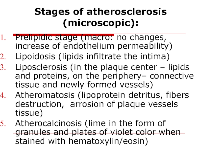 Слайд 11Stages of atherosclerosis (macroscopic):