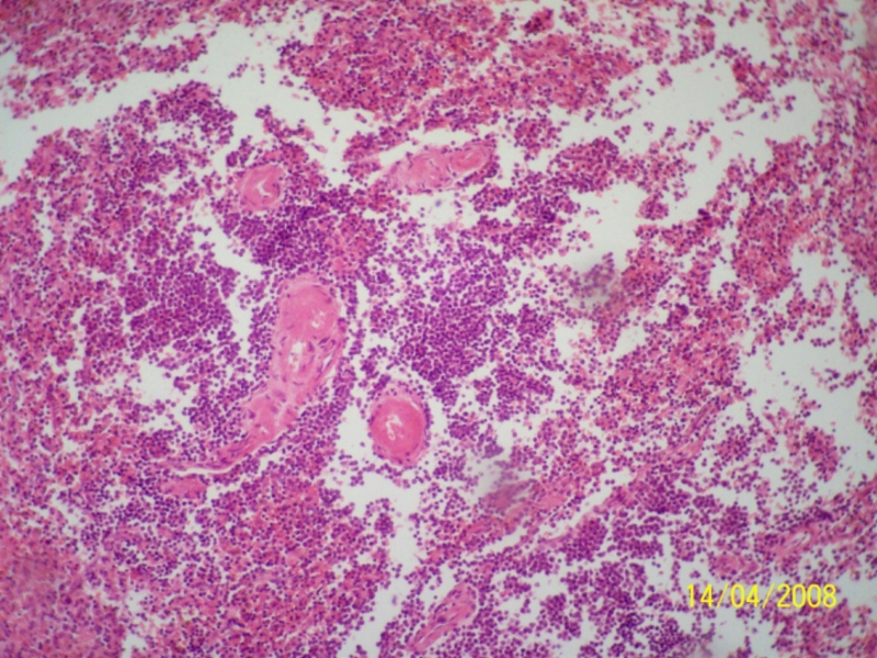 Atherocalcinosis (lime in the form of granules and plates of violet color when stained with hematoxylin/eosin)