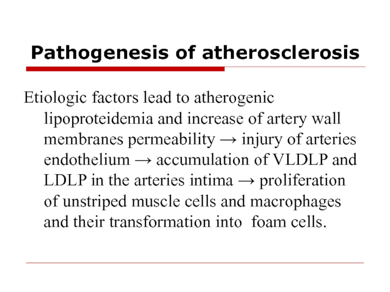 endothelium → accumulation of VLDLP and LDLP in the arteries intima → proliferation of unstriped muscle cells and macrophages and their transformation into foam cells.