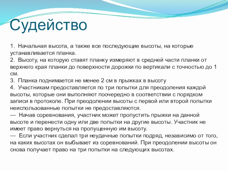 — Начав соревнования, участник может пропустить прыжки на данной высоте и перенести одну или две попытки на другие высоты. Участник не имеет право вернуться на пропущенную им высоту.