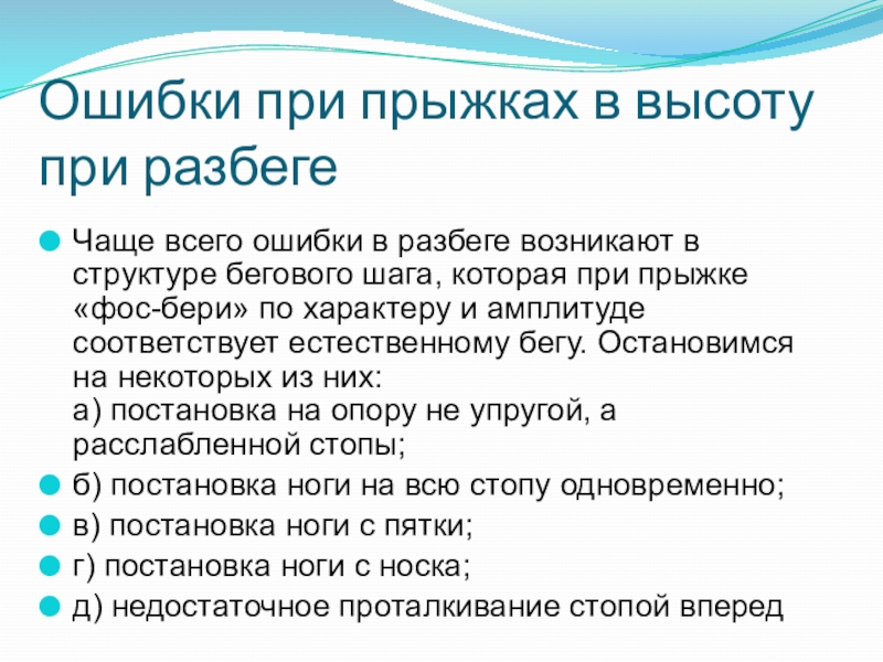 Слайд 9Ошибки при прыжках в высоту при разбеге