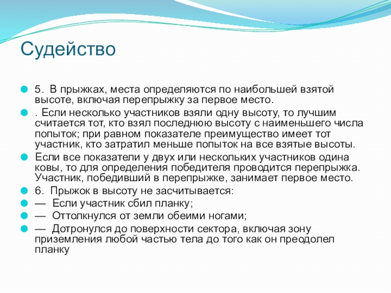5. В прыжках, места определяются по наибольшей взятой высоте, включая