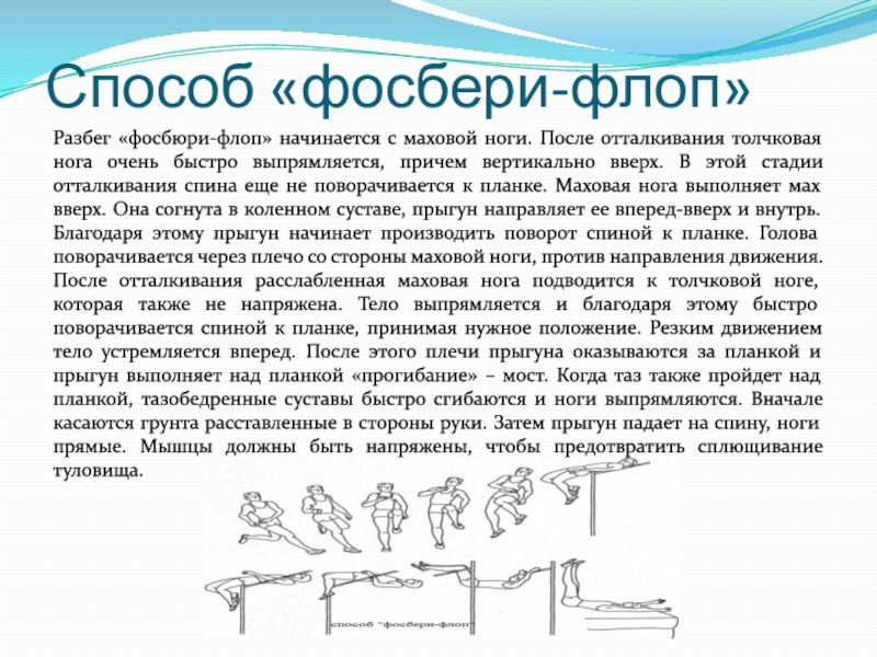 Способ «перешагивание» менее эффективен, хотя этот способ наиболее прост в техническом отношении и поэтому чаще используется на начальной стадии обучения прыжка в высоту. Давайте подробнее рассмотрим способ «фосбери-флоп»