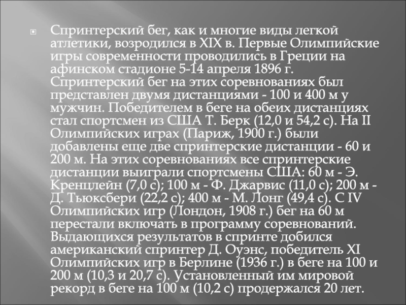 афинском стадионе 5-14 апреля 1896 г. Спринтерский бег на этих соревнованиях был представлен двумя дистанциями - 100 и 400 м у мужчин. Победителем в беге на обеих дистанциях стал спортсмен из США Т. Берк (12,0 и 54,2 с). На II Олимпийских играх (Париж, 1900 г.) были добавлены еще две спринтерские дистанции - 60 и 200 м. На этих соревнованиях все спринтерские дистанции выиграли спортсмены США: 60 м - Э. Кренцлейн (7,0 с); 100 м - Ф. Джарвис (11,0 с); 200 м - Д. Тьюксбери (22,2 с); 400 м - М. Лонг (49,4 с). С IV Олимпийских игр (Лондон, 1908 г.) бег на 60 м перестали включать в программу соревнований. Выдающихся результатов в спринте добился американский спринтер Д. Оуэнс, победитель XI Олимпийских игр в Берлине (1936 г.) в беге на 100 и 200 м (10,3 и 20,7 с). Установленный им мировой рекорд в беге на 100 м (10,2 с) продержался 20 лет.