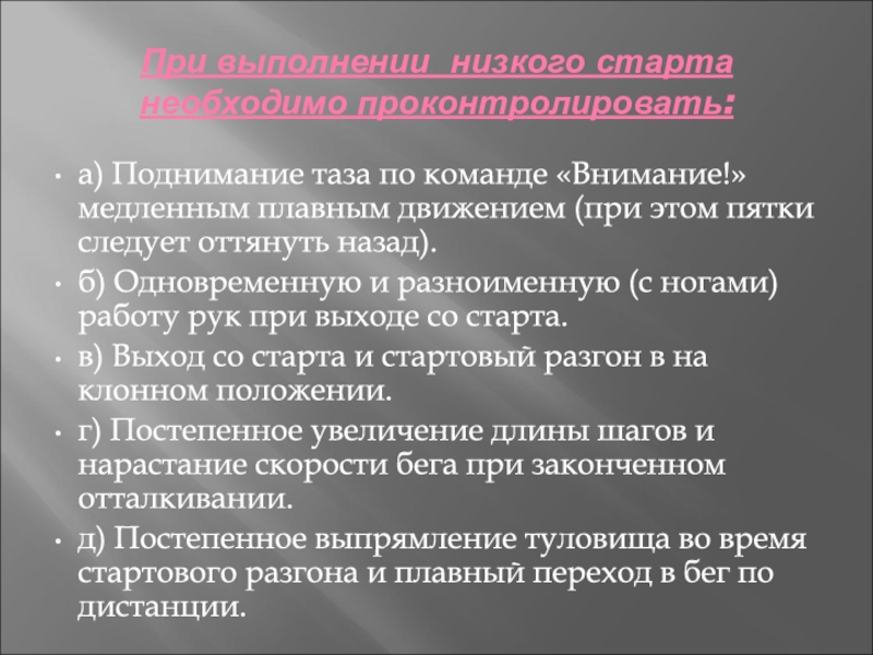 Слайд 12При выполнении низкого старта необходимо проконтролировать: