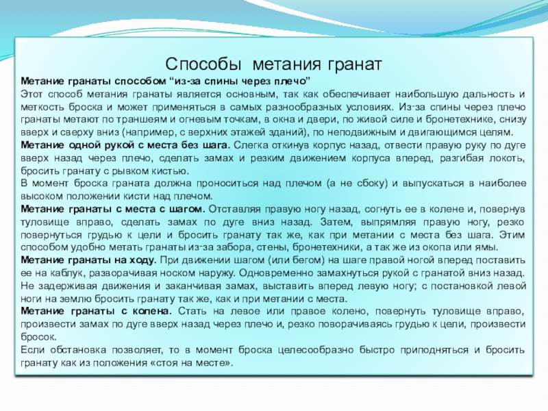 меткость броска и может применяться в самых разнообразных условиях. Из‑за спины через плечо гранаты метают по траншеям и огневым точкам, в окна и двери, по живой силе и бронетехнике, снизу вверх и сверху вниз (например, с верхних этажей зданий), по неподвижным и двигающимся целям.