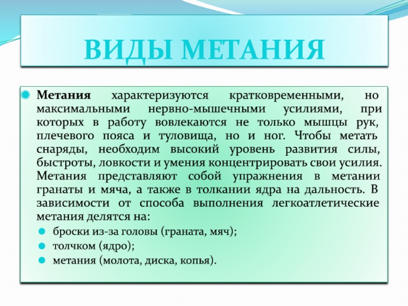 туловища, но и ног. Чтобы метать снаряды, необходим высокий уровень развития силы, быстроты, ловкости и умения концентрировать свои усилия. Метания представляют собой упражнения в метании гранаты и мяча, а также в толкании ядра на дальность. В зависимости от способа выполнения легкоатлетические метания делятся на: