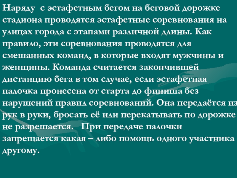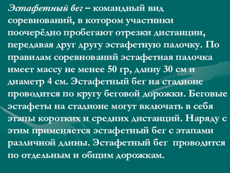 Эстафетный бег – командный вид соревнований, в котором участники поочерёдно пробегают отрезки дистанции, передавая друг другу эстафетную