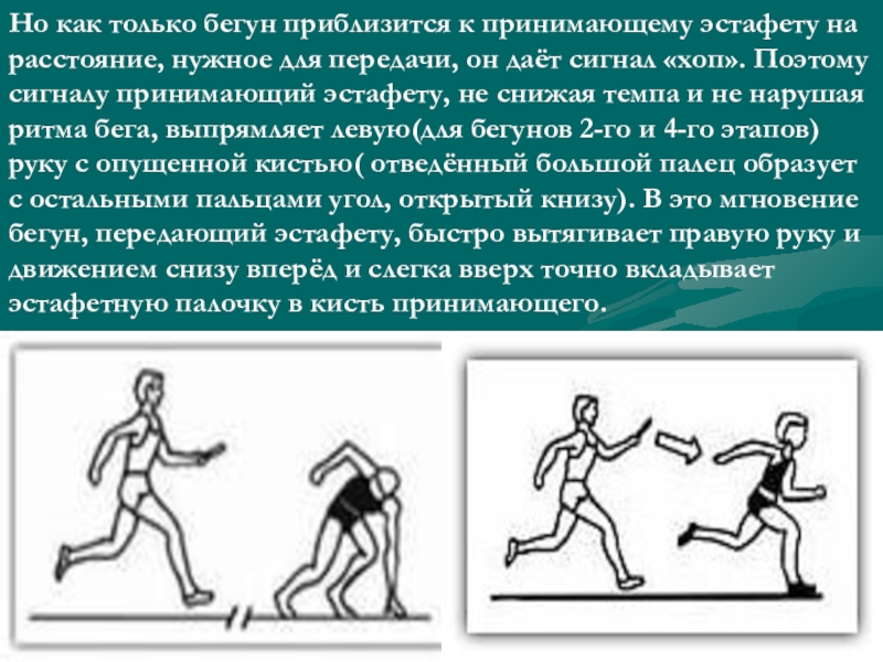 Но как только бегун приблизится к принимающему эстафету на расстояние, нужное для передачи, он даёт сигнал «хоп».