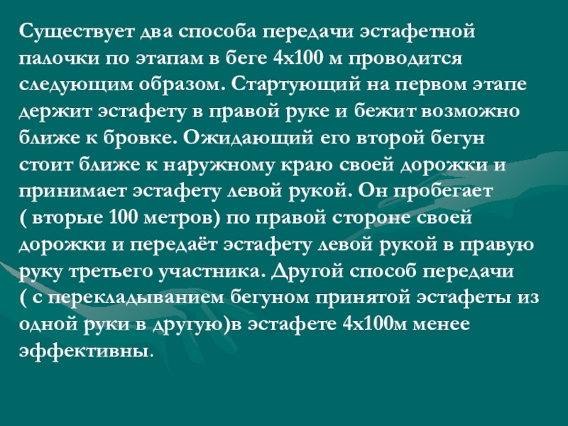 эстафету в правой руке и бежит возможно ближе к бровке. Ожидающий его второй бегун стоит ближе к наружному краю своей дорожки и принимает эстафету левой рукой. Он пробегает ( вторые 100 метров) по правой стороне своей дорожки и передаёт эстафету левой рукой в правую руку третьего участника. Другой способ передачи ( с перекладыванием бегуном принятой эстафеты из одной руки в другую)в эстафете 4х100м менее эффективны.