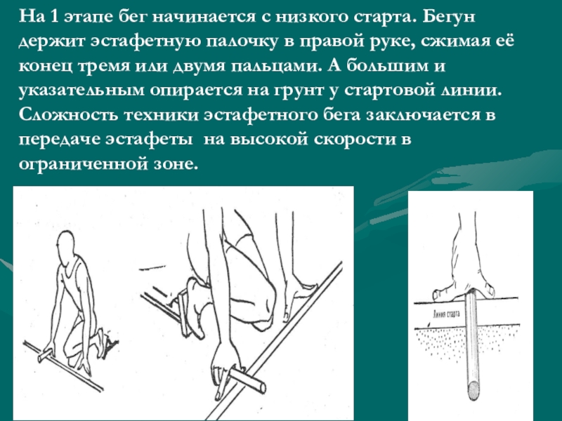 Слайд 4На 1 этапе бег начинается с низкого старта. Бегун держит