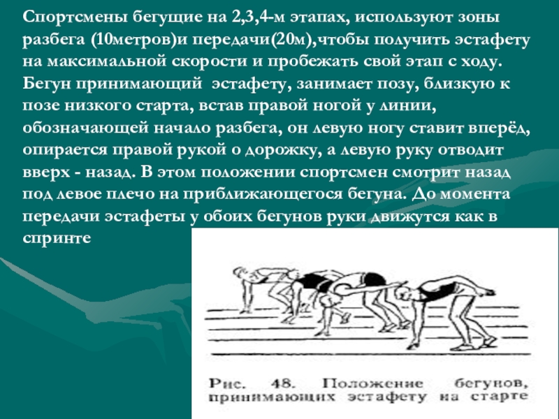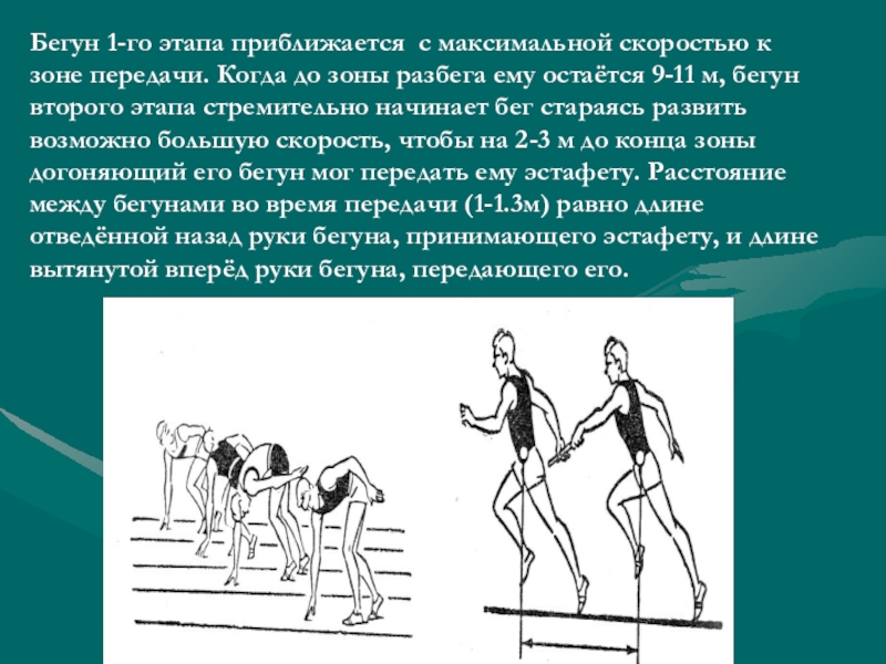 этапа стремительно начинает бег стараясь развить возможно большую скорость, чтобы на 2-3 м до конца зоны догоняющий его бегун мог передать ему эстафету. Расстояние между бегунами во время передачи (1-1.3м) равно длине отведённой назад руки бегуна, принимающего эстафету, и длине вытянутой вперёд руки бегуна, передающего его.